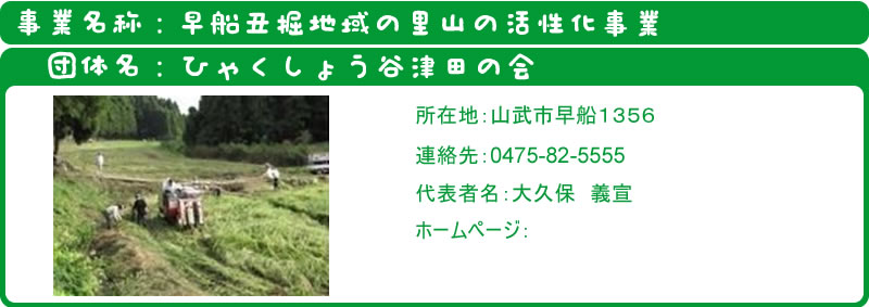 早船丑掘地域の人々の生活と遊び場であった里山は、今では水田や畑の多くが耕作放棄され、森林も放置されてい荒れている。かつてのように里山を再生させたい。山道の改良(8割完了)、谷津田の再生を少しずつ進め、他に3団体がこの里山の活用で活動するようになり注目を集める。しかし、谷津田の中心に座る水田の数haの耕作放棄地の存在、昨年の専門家を招いて行った生態調査でも判明した昆虫、鳥、水棲植物などの存在やそれらを取り巻く樹木・植物群の存在などは一部管理されているが、多くは自然任せになっており、水田の乾田化、ビオトープ造成などに手を加える必要がある。これらの活動を効果的に進めるためにも他団体との協同が必要な段階になっている。