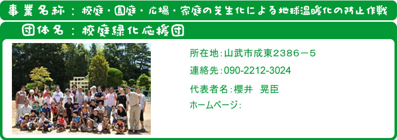 環境問題意識の浸透、地球温暖化防止の推進、地域コミュニティの創造、子供たちの「緑育」のため、校庭緑化の基礎・維持管理の研究会開催と試験植芝を行う。