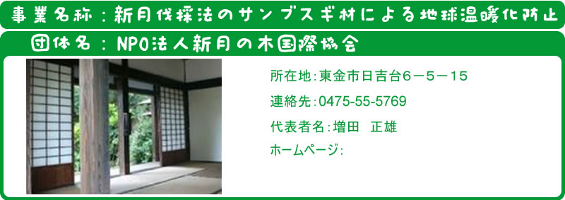 木は、これまで長いあいだ樹木としても木材としても人間に寄り添って人の暮らしや心を支えてきた。言いかえれば樹木は、山を守り空気を再生し、水を育て、陸と海と空すべての生活圏を活かし続けている。しかし、日本の林業及びそれに連なる産業は、今低調期にある。そのため、経済産物としてだけでなく自然環境の大きな担い手である森林は放置され、人々の暮らしから遠ざかっている。しかし、この山武市地域には森林は生き物の活力の源泉であることを良く理解し、「森林蘇生による温暖化防止と地域活性化を同時に達成する地域づくり」を成し遂げたいと思っている人達が少なからず存在する。この人達と連携・協力しさらに人の輪を拡げながら、「森林を活用した温暖化防止」を図る。具体的には木を高耐久、長寿命に導く新月伐採法(適期伐採、適時養生)の技術を用いて、山武地域のシンボルであるサンブスギの魅力と実力を引き出す。それにより、地域の人達の元気を呼び戻し、山武地区に、良い自然環境と木の文化を取り戻す。